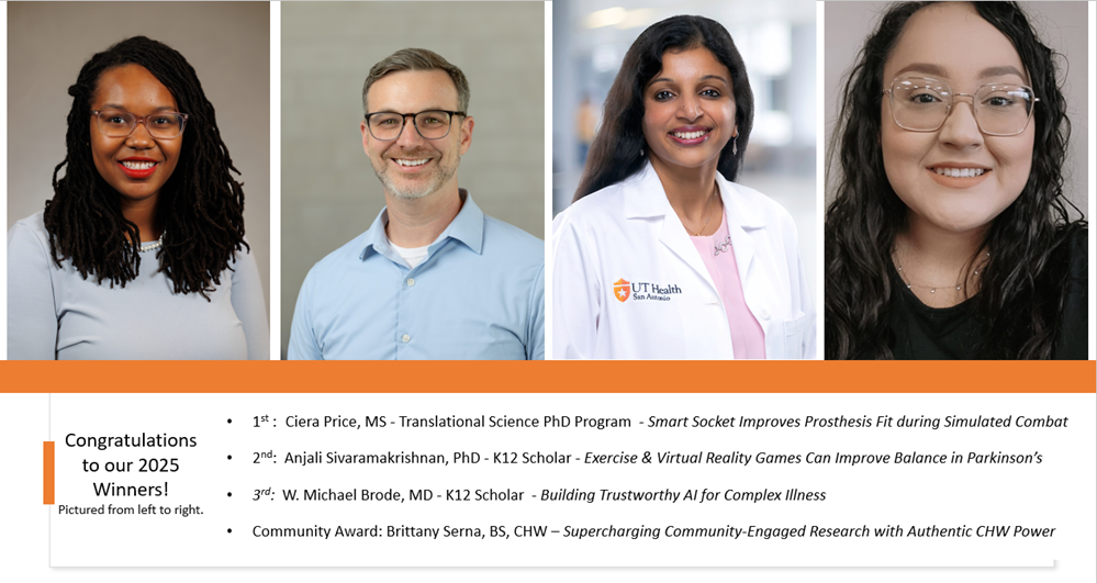 Fourteen presenters (3 community and 11 students/trainee/junior investigators) shared their research findings with 82 online participants. Winners included: Ciera Price, Anjali Sivaramakrishnan, Michael Brode and Brittany Serna. Judges included Destiny Mujica, PhD – IIMS Community Health Advisory Board, Junda Woo, MD – Metro Health, and Camerino Salazar, PhD – Health Research in Action.